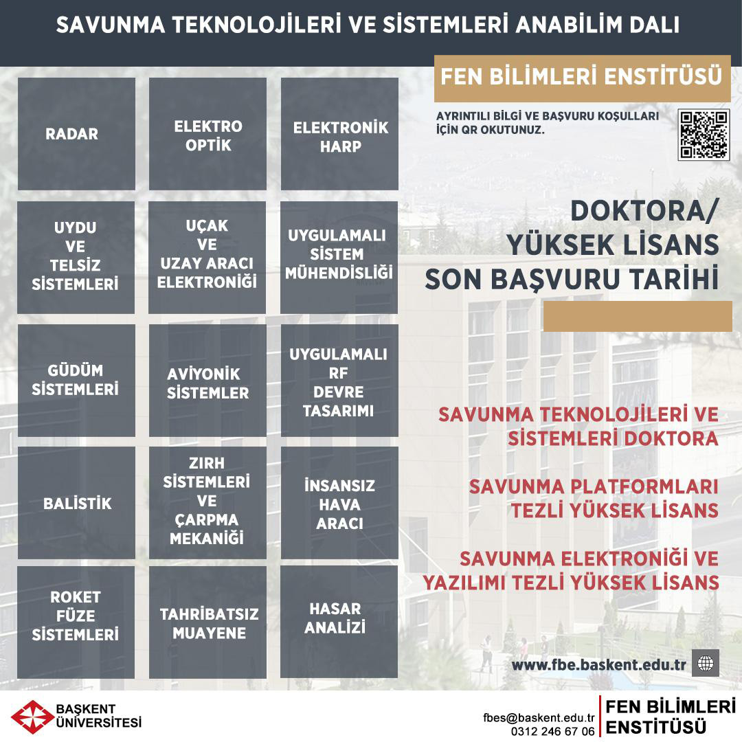 Başkent Üniversitesi Fen Bilimleri Enstitüsü, Savunma Teknolojileri ve Sistemleri Ana Bilim Dalı altında açılan aşağıdaki bu programlar Savunma sanayi kuruluşlarının genç mühendislerine veya bu sektörü çalışma alanı olarak hedefleyen tüm mühendislere alanlarında derinlik kazandıracak bilgi birikimini sağlamak ve çalıştığı kuruluşun bir projesine Yüksek Lisans Tezi boyutu ile çare olacak savunma sanayine odaklı Yüksek Lisans Programları olarak sunulmaktadır.