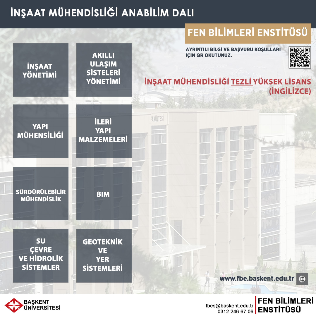 İnşaat Mühendisliği, mühendislik biliminin köklü ve temel dallarından biri olup, farklı amaçlara yönelik yapıları toplum için güvenli ve sürdürülebilir kılmak amacıyla planlama, tasarım, inşaat ve bakım süreçlerini yöneten bir disiplindir. Başkent Üniversitesi, bu alanda gelişen teknoloji ve bilime uyum sağlayabilen, yaratıcı ve yetkin mühendisler yetiştirmeyi amaçlamaktadır. İnşaat Mühendisliği, sürekli gelişen ve yenilenen bir alan olduğundan, bu disiplinde başarılı olmak için hayat boyu öğrenmeye ve teknolojik gelişmelere ayak uydurabilecek esneklik ve yenilikçi yaklaşımlar gerekmektedir. Önemi giderek artan ve karmaşıklaşan problemleri zaman, kaynak, çevre, güvenlik, sosyal etmenler, ekonomi ve benzeri olgulardan kaynaklanan kısıtlar içerisinde çözmek İnşaat Mühendisliği alanında karşılaşılan önemli bir sorundur. Başkent Üniversitesi, ülkemizin ve üniversitenin bulunduğu coğrafi bölgenin üretim ve teknolojik hedeflerini göz önüne alarak, nitelikli eğitim ve öğretim sunarak, ulusal değerlere saygılı, bilgili ve konusunda yetkin öğrenciler yetiştirmeye öncelik vermektedir. Başkent Üniversitesi İnşaat Mühendisliği Tezli Yüksek Lisans Programı’nın amaçları,